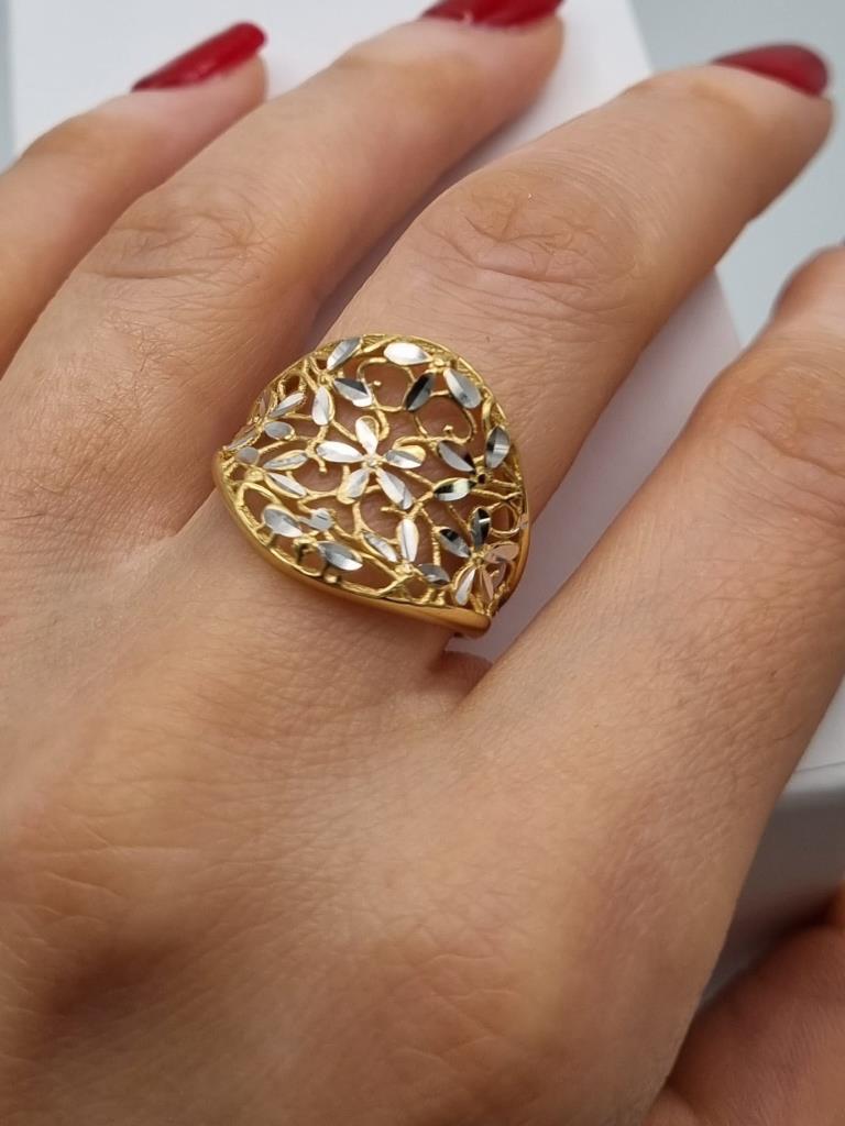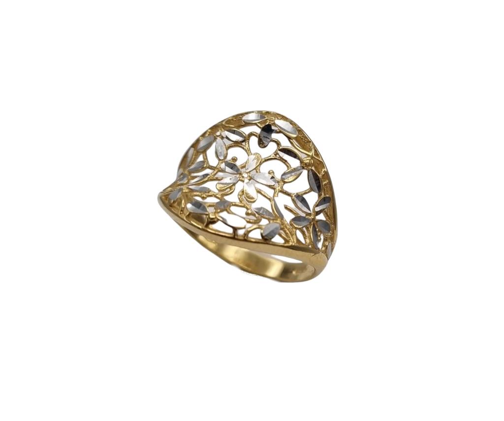 Anello in oro giallo e bianco 9kt.Lavorazione traforata artigianale.Presenta il gambo sottile che poi si allarga lasciando spazio a questo meraviglioso ricamo.Misura 16