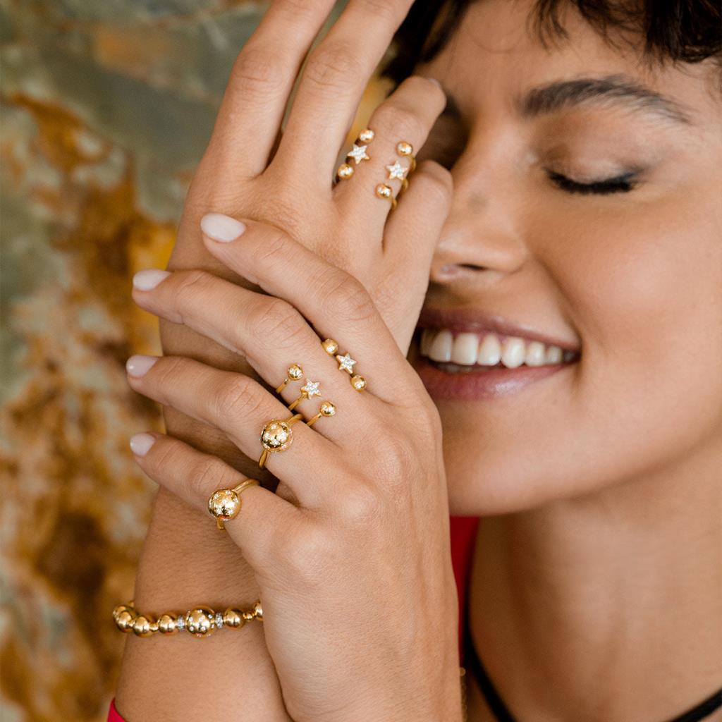 Anello con semisfera starball small size.L'anello è regolabile e comodo per essere indossato anche al dito mignolo.La sfera Starball è una costellazione di zirconi e stelle di varie dimensioni.Una collezione lontana anni luce dalla banalità, ricercata, originale, ultra chic.Argento 925, galvanica oro 18 kt e zirconi.L'anello è aperto e si può regolare la misura maneggiandolo con delicatezza. Diametro sfera: 0,9cm; Diametro anello: 1,9cmNichel freeFatto in Italia, con amore