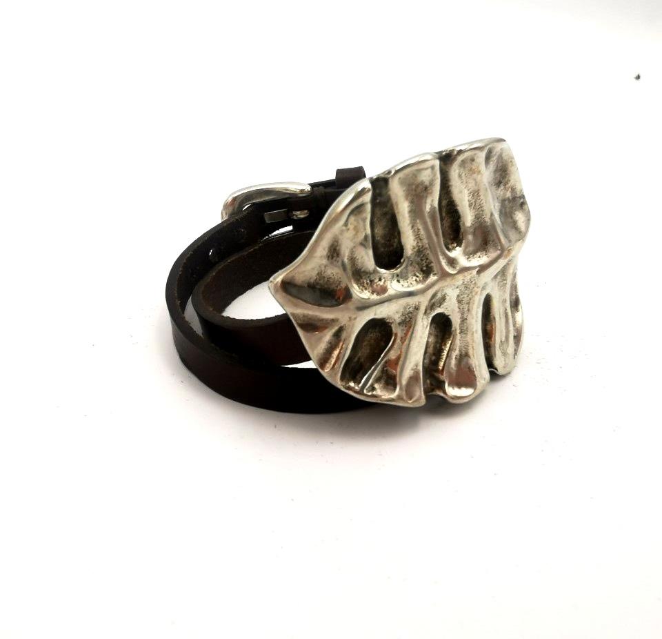Originale bracciale con un design unico, tipo braccialetto, elaborato a forma di foglia XL in bagno d’argento di ispirazione tropicale e un filo di cuoio marrone che lo avvolge a mo’ di liana. Una creazione da sfoggiare in momenti speciali. Fatto 100% a mano in Spagna. Un gioiello ad Edizione Limitata, creato da UNOde50.
