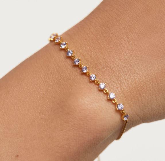 Bracciale VictoriaMateriale: Argento sterling 925Finitura: Placcatura in oro 18kPietre: Zircone lavandaCatena: Chiusura regolabile da 15 a 18 cmPeso: 1.5 g*La tonalità delle pietre semipreziose potrebbe variare leggermente a causa della loro origine naturale"