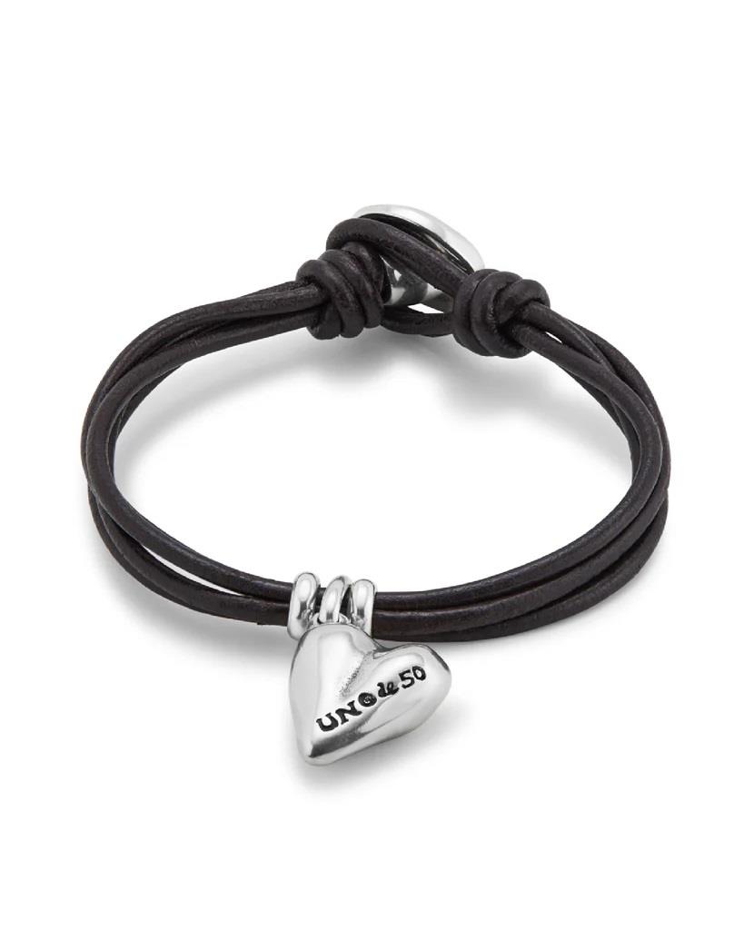 Bracciale della collezione Uno de 50 Beloved Pretty Love da donna. Colore: argento e marrone. Il gioiello è realizzato con tre fasce in cuoio composto da un ciondolo a forma di cuore in lega metallica rivestita in argento 15 micron. La lunghezza 15,7 cm con chiusura a T-Bar.