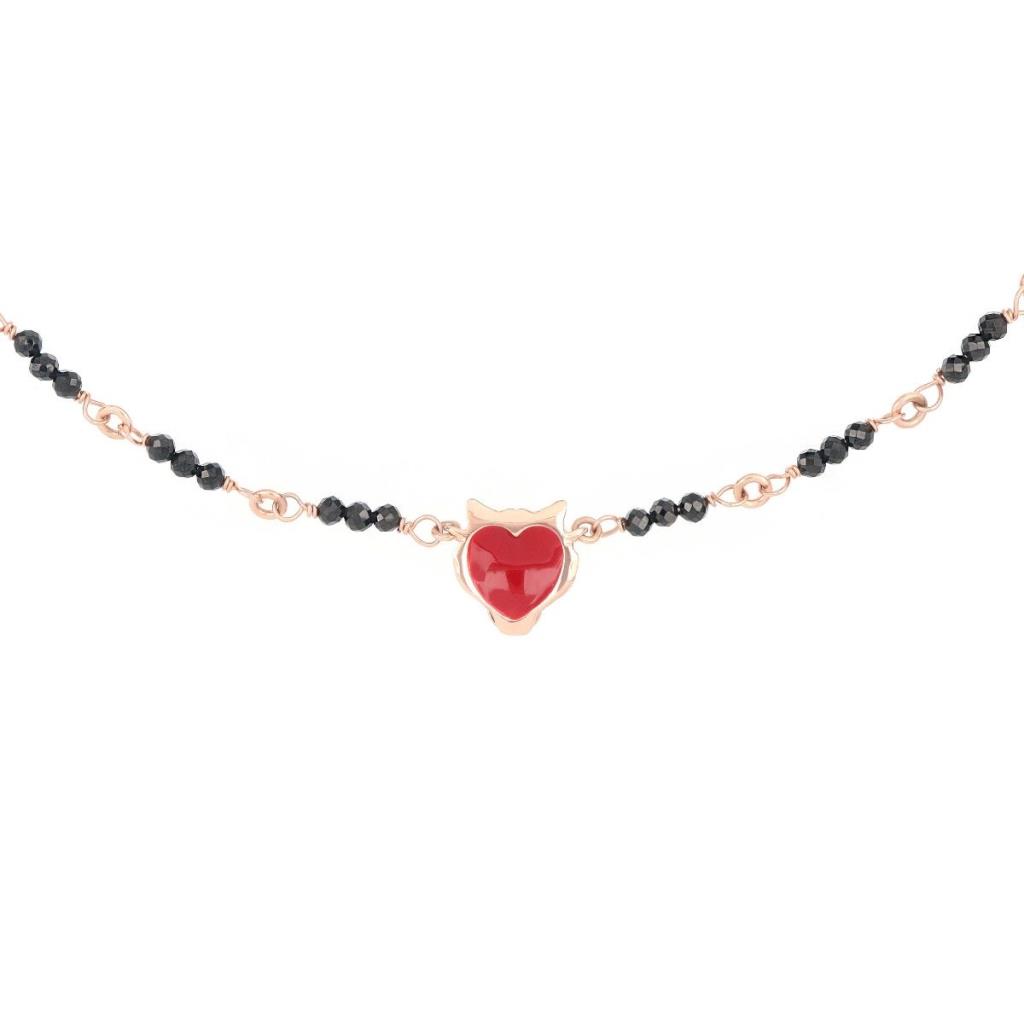 Girocollo della Collezione Yanez realizzato in argento 925 con galvanica oro rosa ad alto spessore e resistenza.è presente un rosario di pietre di Spinello e una tigre tridimensionale centrale con smaltatura.La tigre misura 14 mm in altezza e 13 mm in larghezza.La lunghezza totale del girocollo è di 44,5 cm.Inoltre è presente il cuore Maman con smaltatura nera.Chiusura a moschettone.