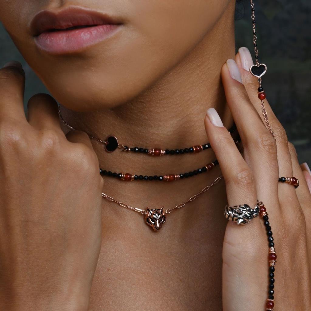 Girocollo realizzato in argento 925 con galvanica oro rosa ad alto spessore e resistenza con pietre di Spinello e di Corniola intervallate da piccole sfere.Il girocollo presenta un cuore Maman smaltato di nero e può essere regolato da un minimo di 30 cm fino ad un massimo di 41 cm grazie alla piccola sfera scorrevole.Chiusura a moschettone.