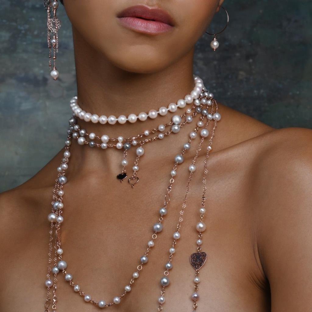 Girocollo della Collezione Perla di Labuan realizzato in argento 925 con galvanica oro rosa ad alto spessore e resistenza.Il girocollo presenta delle perle dal diametro di 8 mm.è presente il cuore Maman smaltato di nero.Il girocollo può essere regolato da un minimo di 32 cm fino ad un massimo di 42 cm grazie alla piccola sfera scorrevole.Chiusura a moschettone.