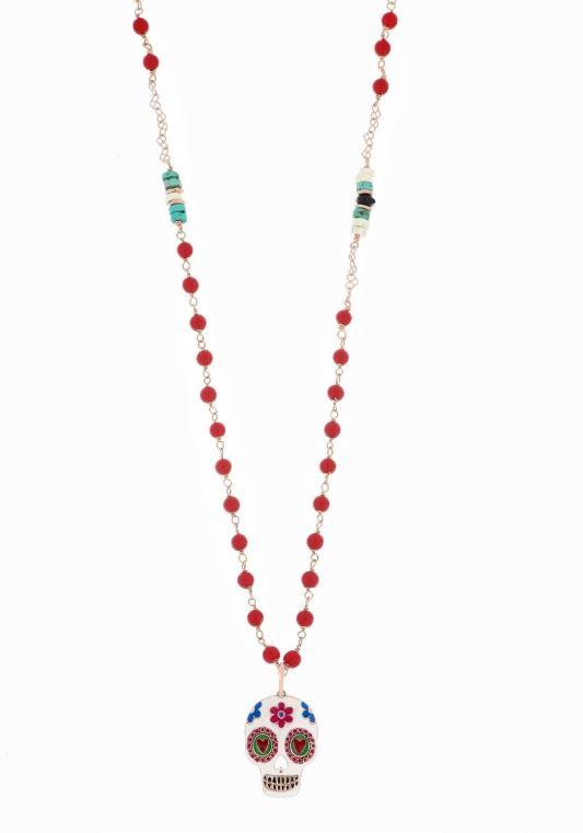 Collana lunga della Collezione Tulum con teschio grande smaltato realizzata in argento 925 con galvanica oro rosa ad alto spessore e resistenza.La collana ha una lunghezza fissa di 88,5 cm.Il teschio smaltato è lungo 21 mm x 15 mm.Sono presenti pietre di Aulite Turchese Africano, di Aulite bianco e di Agata nera e un rosario di pasta di Corallo.Il cuore Maman è nella versione smaltata nera.La catena è caratterizzata da maglie a forma di cuore.