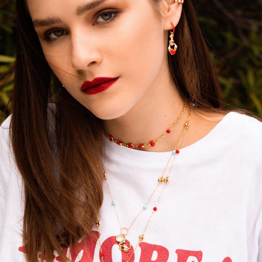 Collana con maglia allungata con inserti circolari color turchese, soggetto centrale granchio e capsule tag.Il granchietto acchiappa sogni è uno dei soggetti principali della capsule collection Marine Love di Rue des Mille disegnata in collaborazione con il designer Alessandro Enriquez.Lunghezza: 50 cm + estensione 5 cm.Dimensione soggetto: 2 cmMateriale: Argento 925Finitura disponibile: oro giallo 18KtNichel freeFatto in Italia, con amore