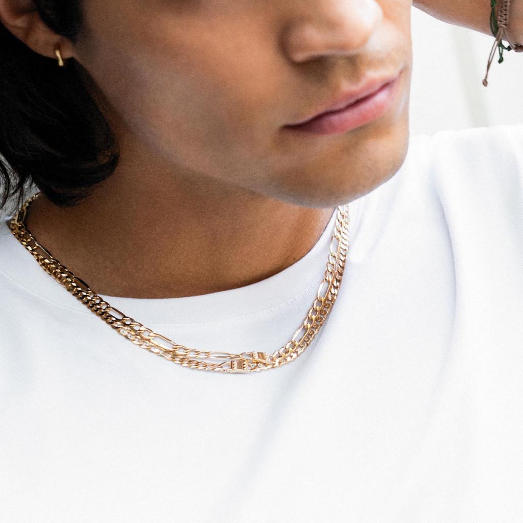 Gircollo con maglia vintage groumette e moschettone con borchie.Con Tangle abbiamo voluto offrire gioielli tradizionalmente associati al guardaroba maschile da indossare in modalità totalmente libera, in cui ogni persona ha il comando del proprio racconto.Argento 925, galvanica oro 18 ktDimensione: Lunghezza 50 cmNichel freeFatto in Italia, con amore