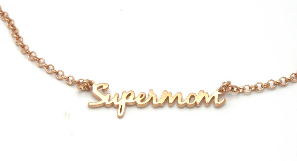 Collana in argento 925 galvanica oro rosa 18 kt, scritta Super Mom, chiusura a moschettone.Lunghezza Collana 40/44 cm