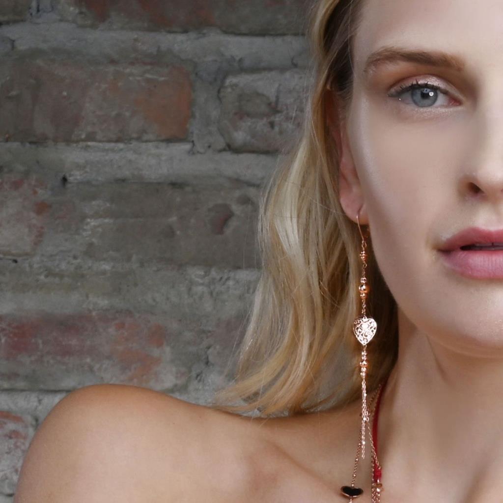 Orecchino singolo a monachella della Collezione Cuore Vittoriano realizzato in argento 925 con galvanica oro rosa ad alto spessore e resistenza.Il cuore misura 12 mm in altezza e presenta degli intarsi decorativi.Sono presenti delle sfere decorative e una cascata di catene.La lunghezza totale dell'orecchino, inclusa la monachella, è di 11,5 cm.