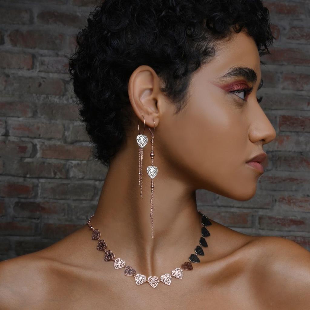 Orecchino singolo a cerchio della Collezione Cuore Vittoriano realizzato in argento 925 con galvanica oro rosa ad alto spessore e resistenza.Il cuore brunito misura 12 mm in altezza e presenta degli intarsi decorativi.Sono presenti delle sfere decorative e una cascata di catene.La lunghezza totale dell'orecchino è di 9 cm.