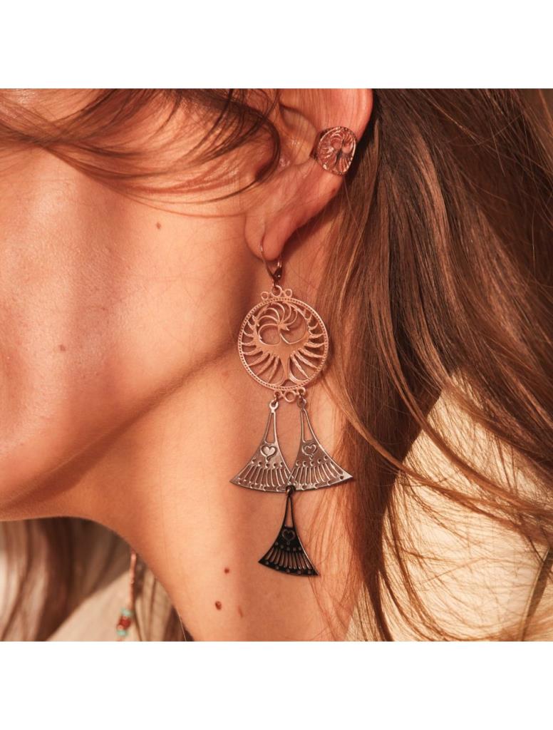 Orecchino singolo a monachella della Collezione Fenice SS21.L'orecchino è realizzato in oro argento 925 con placcatura oro rosa ad alto spessore e resistenza.Inoltre i tre pendenti sono realizzati in rutenio.L'orecchino presenta una piastra con fenice centrale e tre pendenti con elementi decorativi incisi. Il diametro della piastra è di 28 mm.L'altezza di ogni pendente è di 28 mm.La lunghezza totale dell'orecchino, compresa la monachella, è di 10,5 cm.