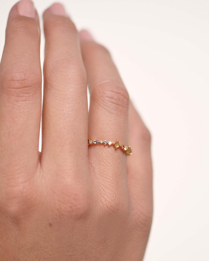 ANELLO IN ORO PAPILLONL’anello Papillon raccoglie i 7 colori della tavolozza della collezione: uno statement vivo e delicato che riempirà le tue mani di luce e di colore. Nata fra tavolozze e tele infinite, la collezione è un omaggio al celato mondo degli atelier. Ispirate dal loro fascino e dalla loro maestria, le pietre semipreziose in 7 tonalità dipingono il ritratto finale della collezione.MATERIALE: argento sterling 925 FINITURA: placcatura in oro 18k PIETRE: LABRADORITE ACQUAMARINA ZIRCONE LIGHT CHAMPAGNE ZIRCONE GREEN PERIDOT ZIRCONE LONDON BLUE ZIRCONE ROSE RED ZIRCONE NERO ZIRCONE BIANCODiametro charm: 24 mmPeso: 1,00 g*La tonalità delle pietre semipreziose potrebbe variare leggermente a causa della